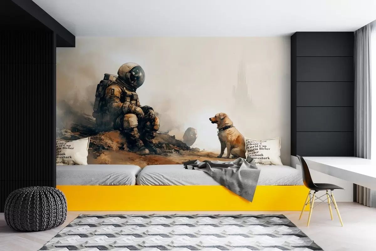 Fototapet peisaj post-apocaliptic cu un astronaut și un câine Nr. w03115