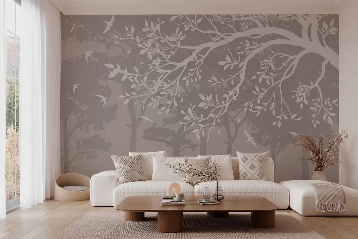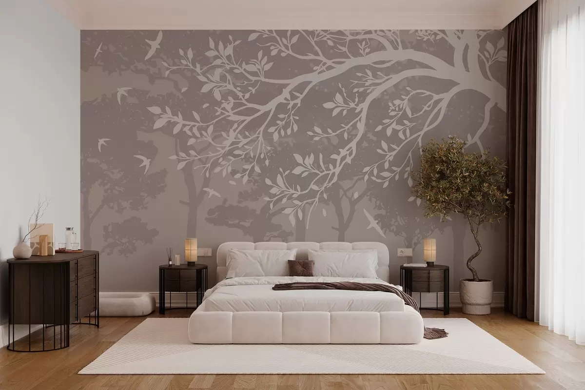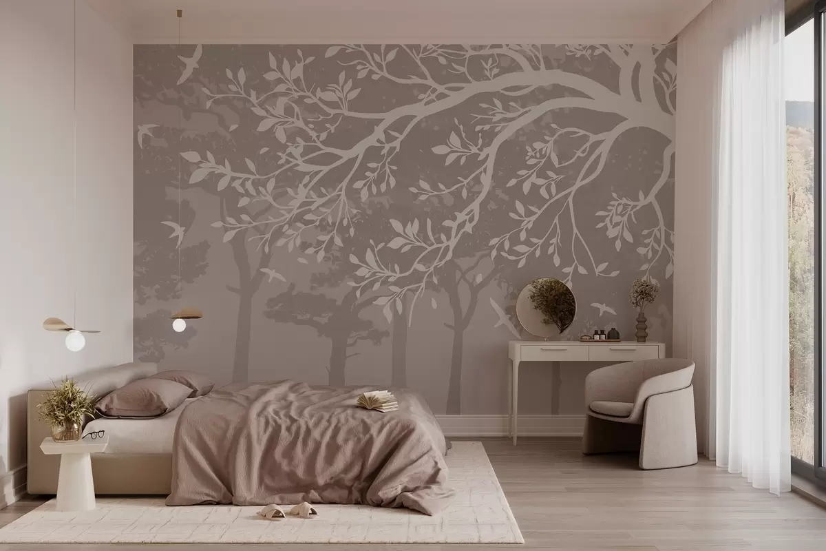 Fototapet silueta unei ramuri cremoase de copac cu păsări, pe fundalul pădurii Nr. w03116
