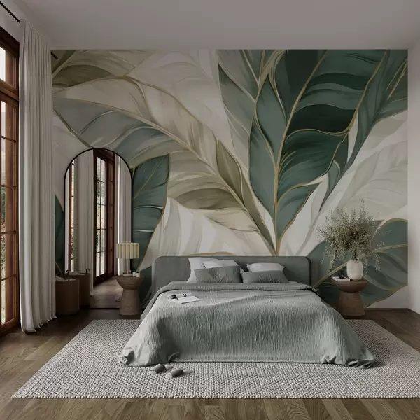 Fototapet Frunze tropicale verzi pe fundal gri și alb Nr. w03124