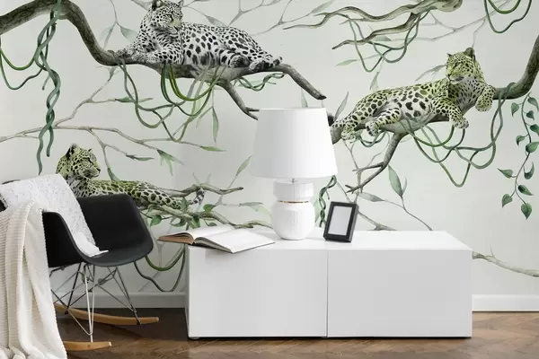 Fototapet Leoparzi pe copaci junglă, liane, tropicale, animale sălbatice, paletă de culori verzi Nr. w03146v1