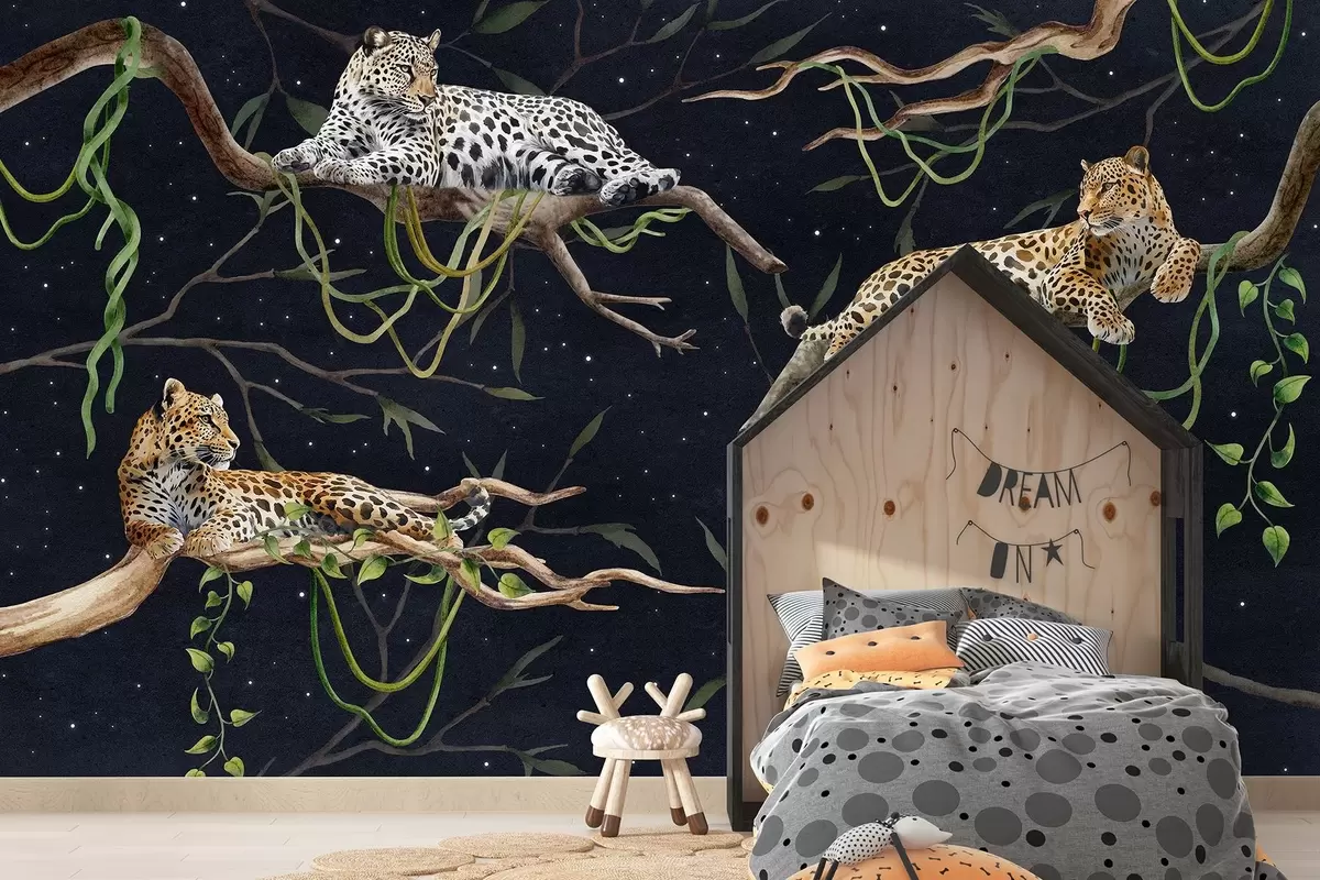 Fototapet Leoparzi pe copaci jungla, liane, tropicale, animale sălbatice, cerul de noapte cu stele Nr. w03148