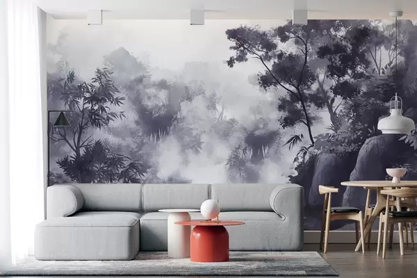 Fototapet Peisaj oriental, junglă, copaci, stil acuarelă, culori gri Nr. w03149v1