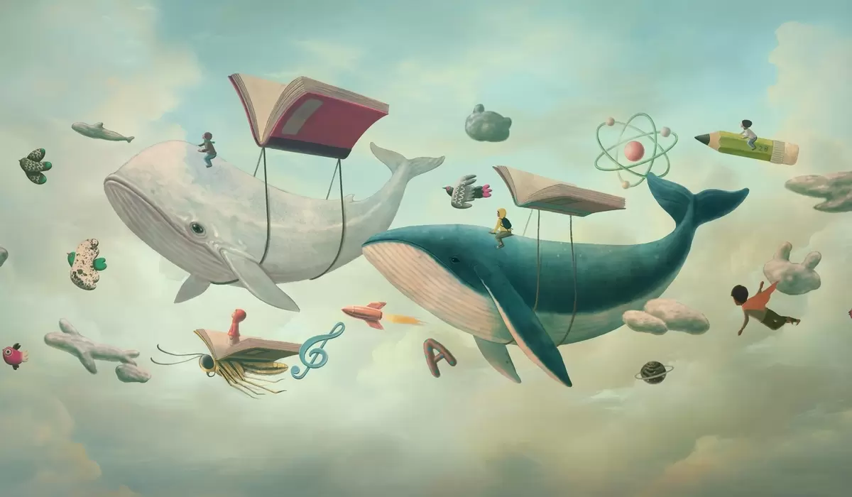 Fototapet O ilustrație capricioasă a balenelor care zboară pe cer sub baloane în formă de carte Nr. w03327v2