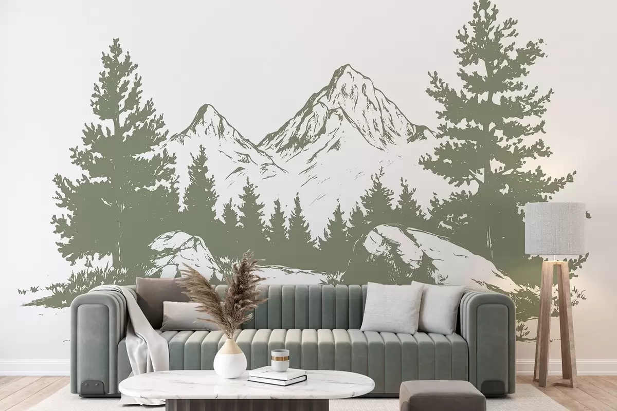Fototapet Alpi, munți cu pădure, desen liniar, culoare verde Nr. w03342v1