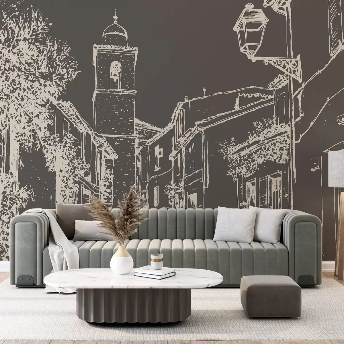 fototapet Strada orașului, arhitectură frumoasă, clădiri, Marea Mediterană, desen liniar, culoare închisă w03345v2