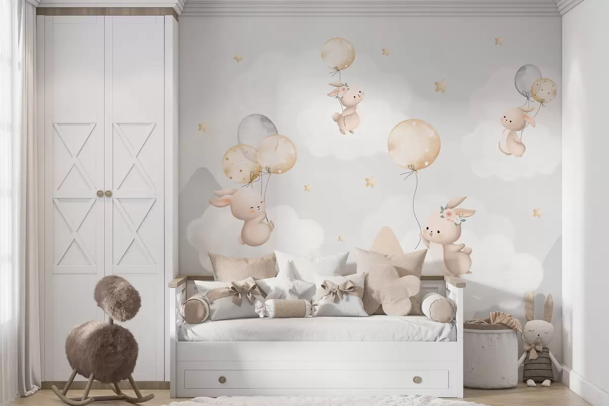 Fototapet Iepurași cu baloane pe nori printre vârfuri de munte Nr. w03375v1