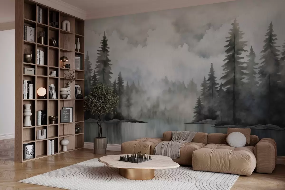 Fototapet Pădure, lac și cer înnorat în stil acuarelă Nr. w03387