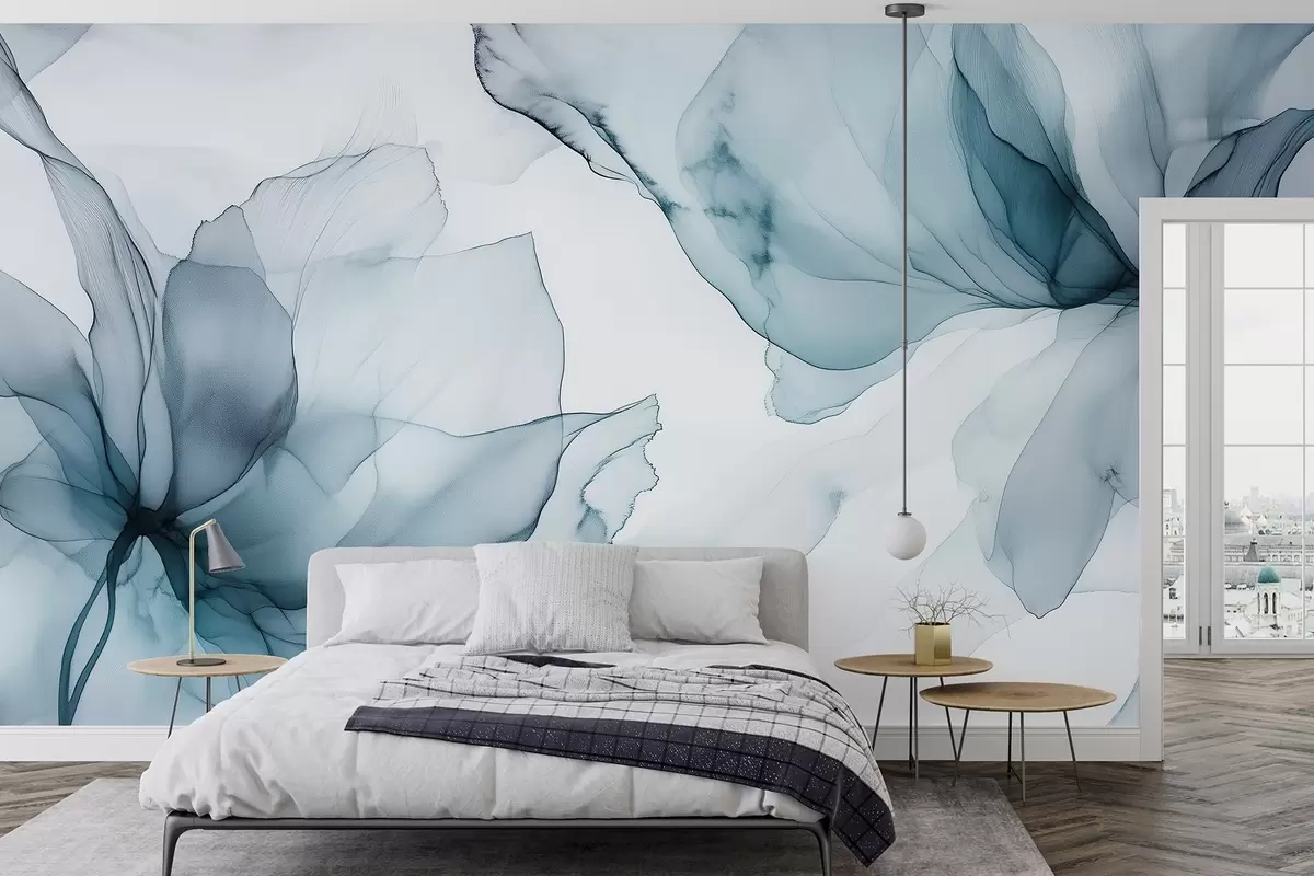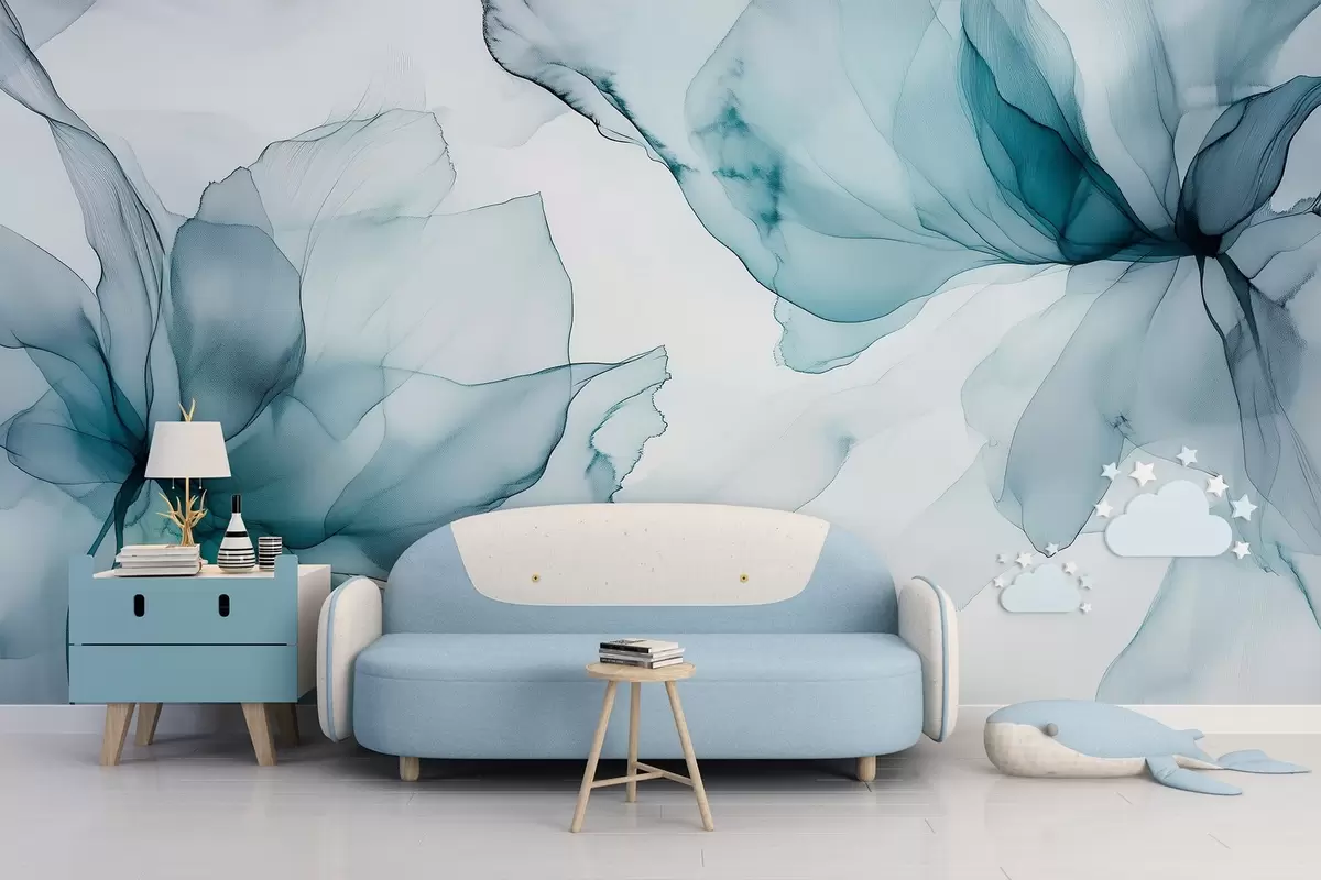 Fototapet Flori în stil fluid, abstracție florală, acuarelă, paleta de culori albastru Nr. w03406v2