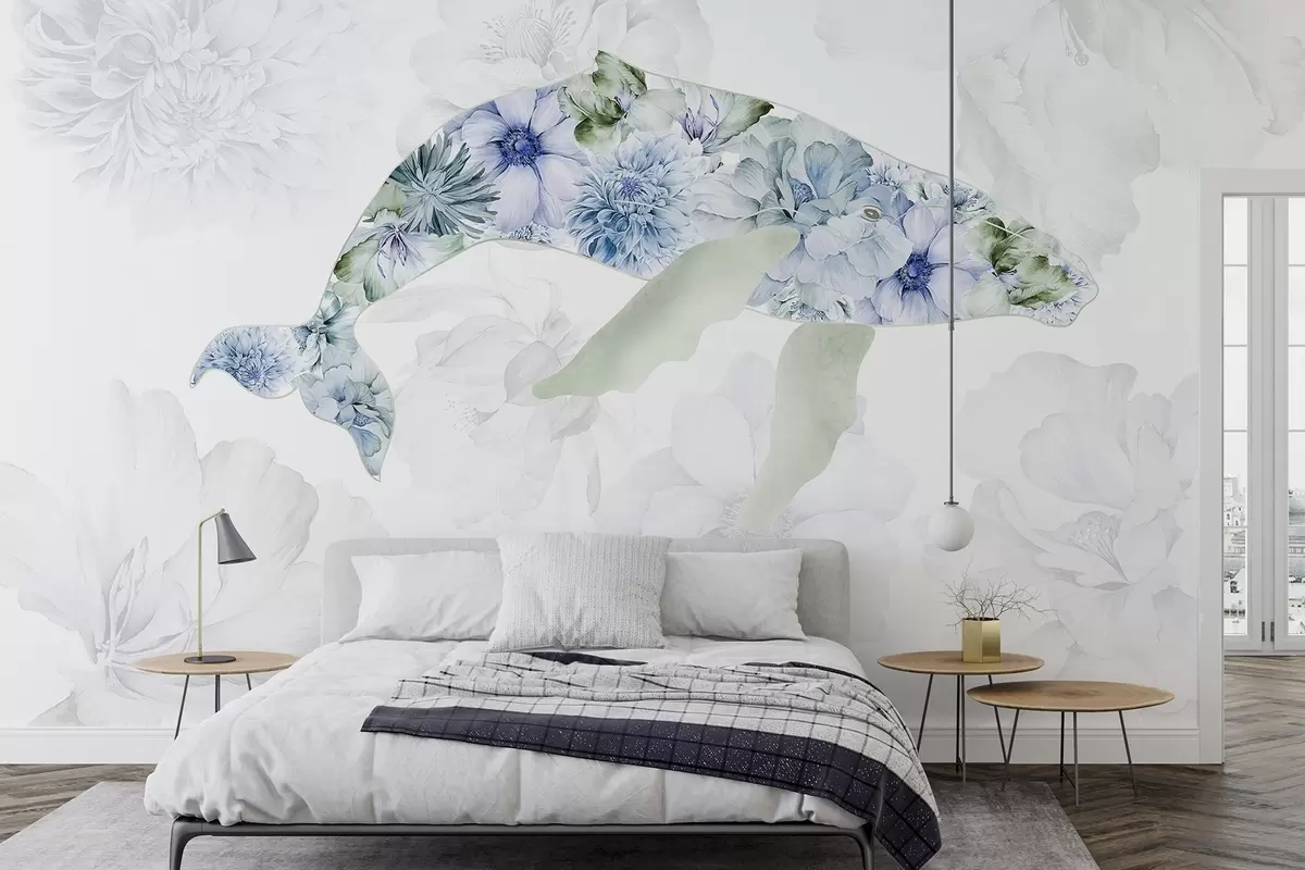 Fototapet Balenă cu flori de acuarelă, animale oceanice, minimalism, albastru și verde Nr. w03446v2