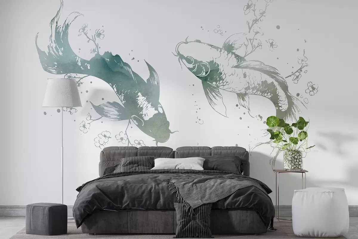 Fototapet Pește acuarelă, stil oriental, cireș, culori verzi Nr. w03447v2