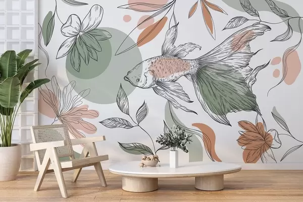 Fototapet Linie de desen pește cu flori, minimalism, marin, floral, culori naturale Nr. w03448