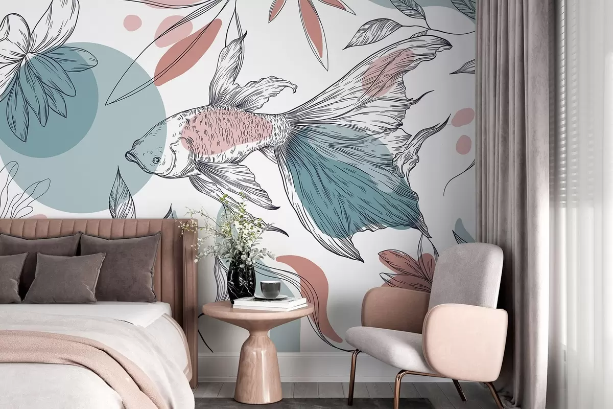 Fototapet Linie de desen pește cu flori, minimalism, marin, floral, albastru și roz Nr. w03448v1