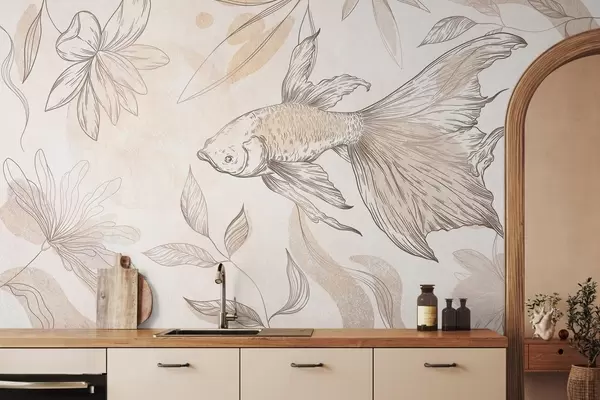 Fototapet Pește cu elemente florale, fundal bej, desen liniar Nr. w03517