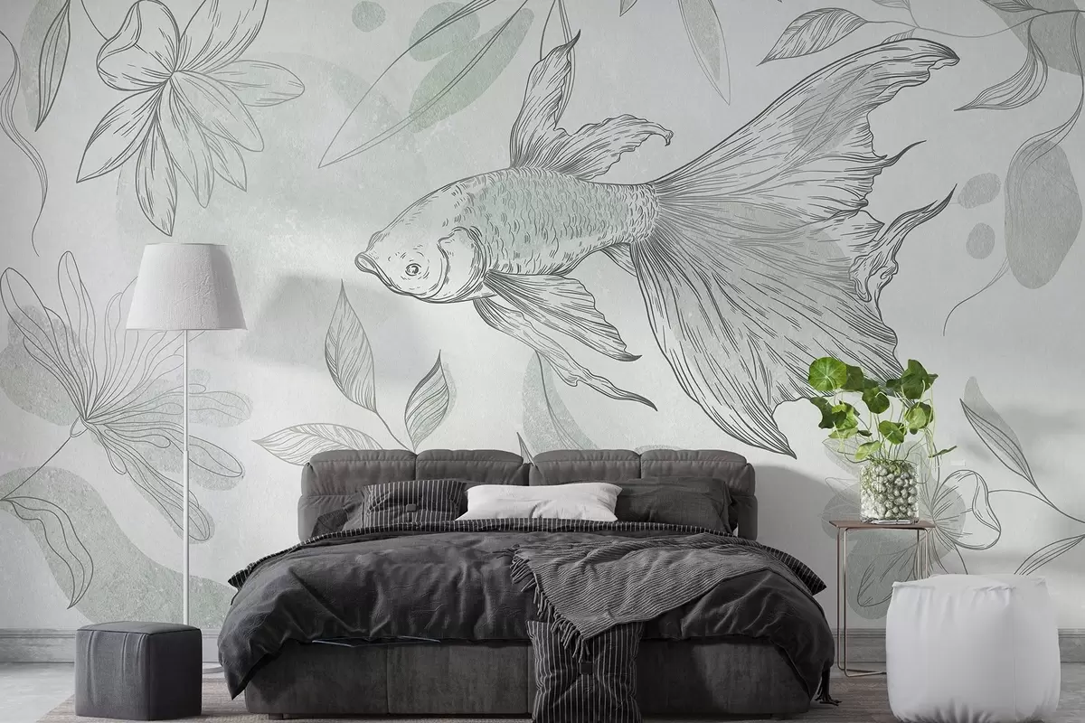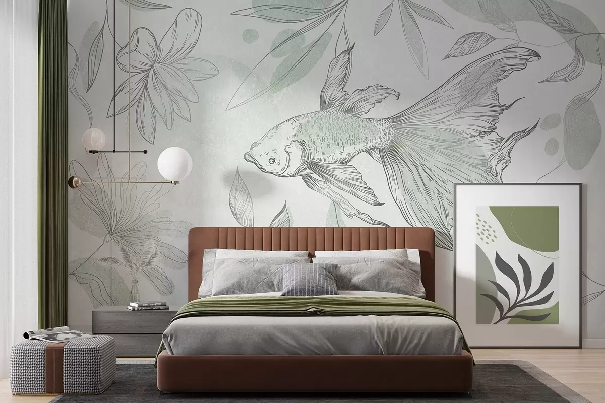 fototapet Pește cu elemente florale, fundal verde, desen liniar w03517v1