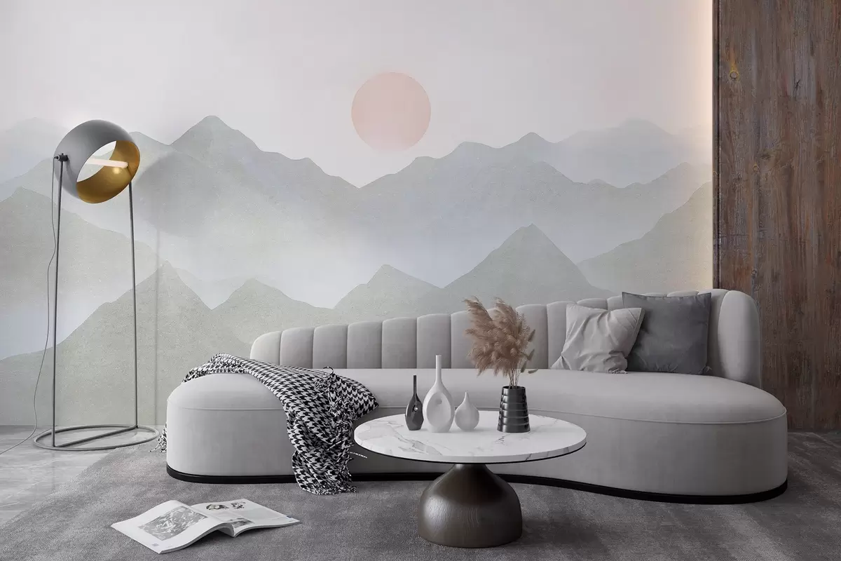 Fototapet Boho stil munți peisaj, apus de soare, pastel moale, gri Nr. w03547v1