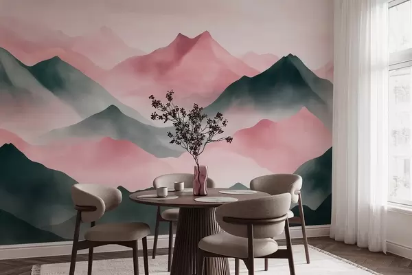 fototapet Munți peisaje, stil acuarelă, ceață, roz și gri w03548v1