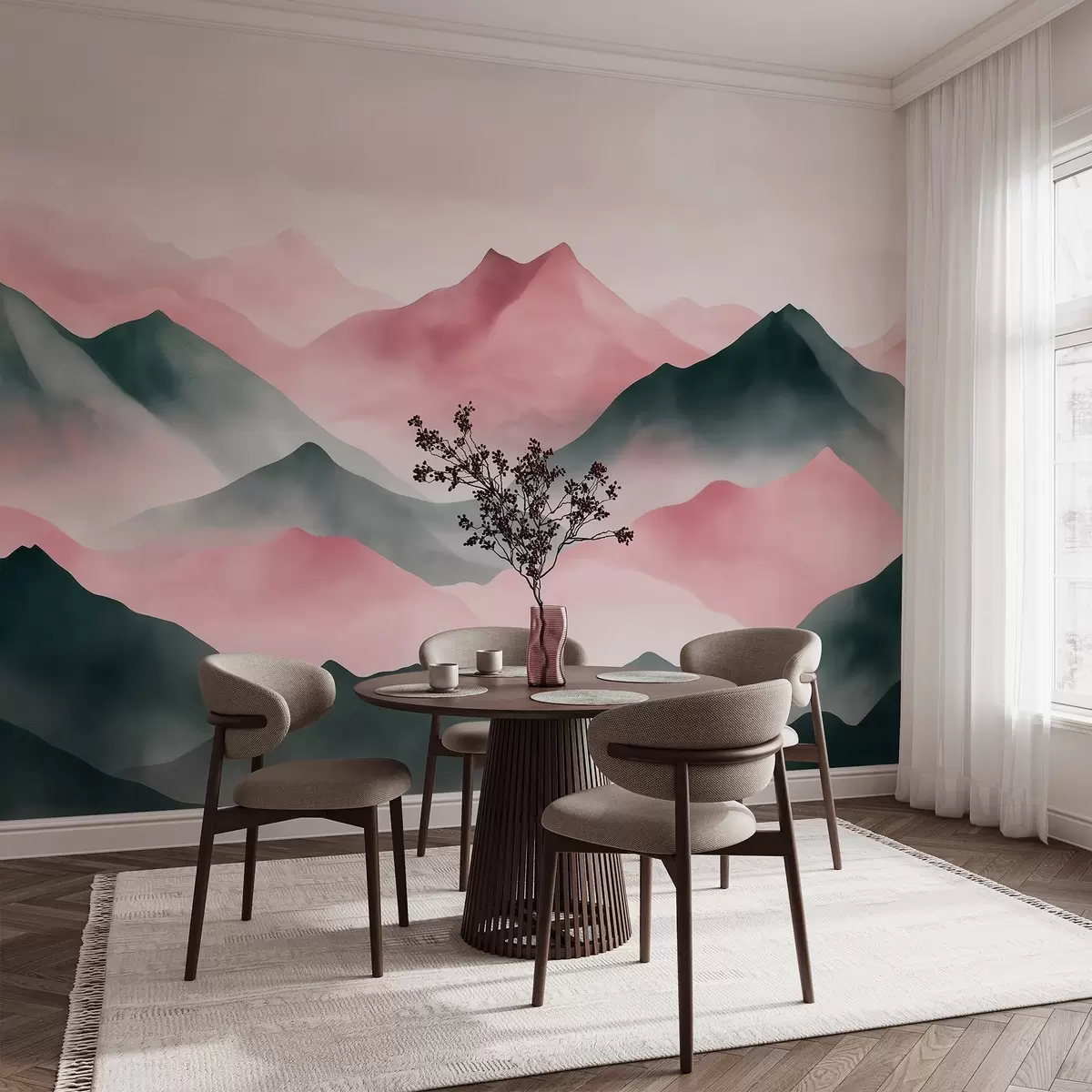 Fototapet Munți peisaje, stil acuarelă, ceață, roz și gri Nr. w03548v1