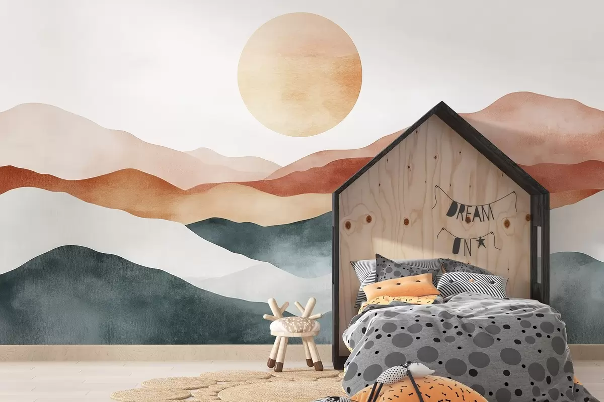Fototapet Munți de acuarelă cu soare, stil boho, roșu, portocaliu, gri Nr. w03551
