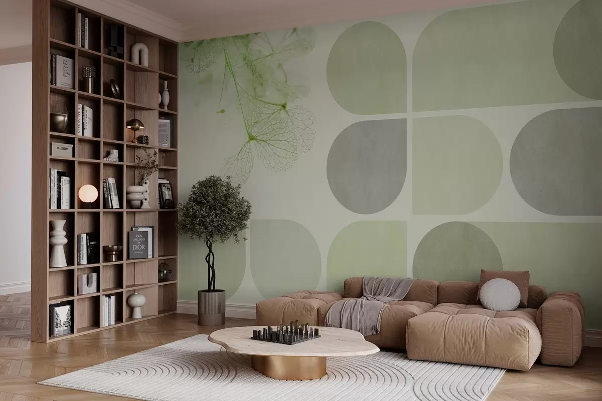 Fototapet geometrie și flori uscate cu nervuri în tonuri verzi Nr. w03617v1