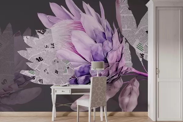 Fototapet Protea flori, arta ziarului, florale, tropicale, fundal întunecat, culori violet Nr. w03667v2