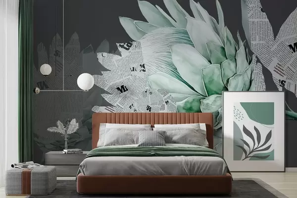 Fototapet Flori Protea, arta ziarului, floral, tropical, fundal întunecat, culori verzi Nr. w03667v3