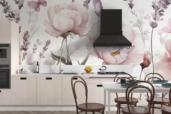 Fototapet Pajiște de flori, bujori, lavandă, fluturi, stil acuarelă, culori roz Nr. w03668