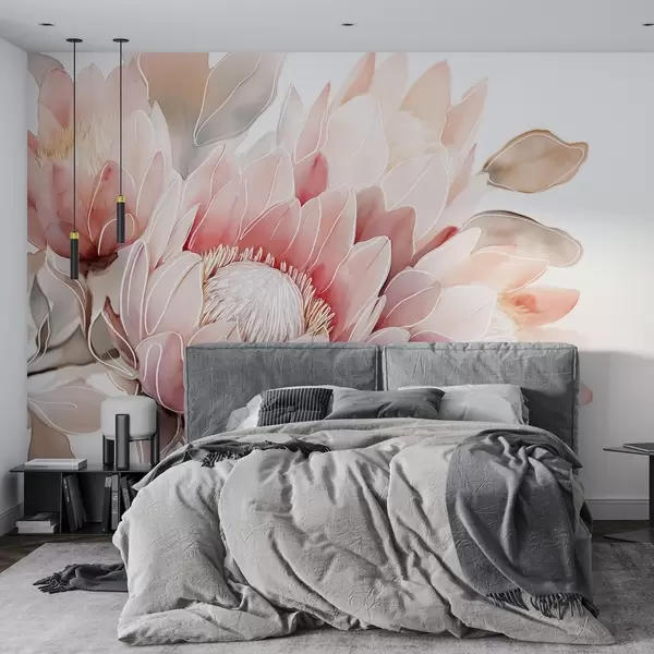 Fototapet Frumoase flori protea, desen line art, tropical, culori naturale Nr. w03669