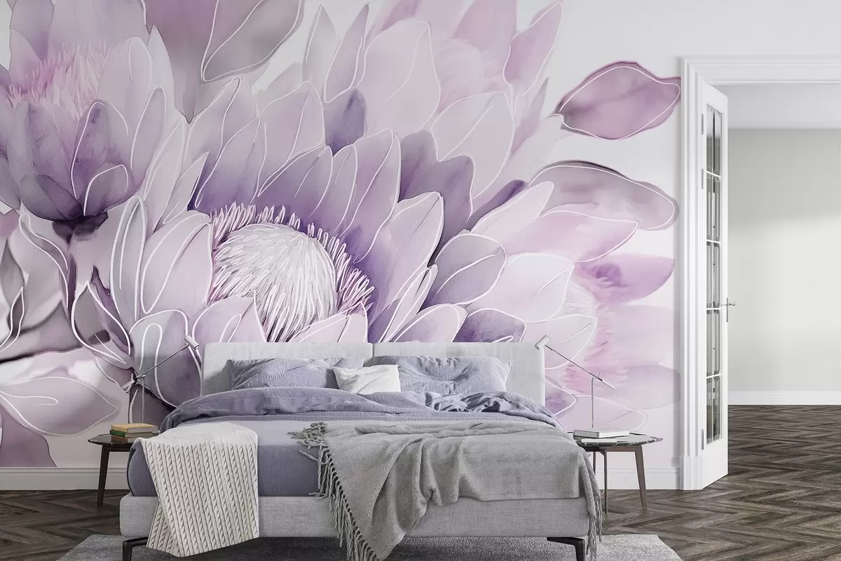 Fototapet Frumoase flori protea, linie de arta desen, tropicale, culori violet Nr. w03669v1