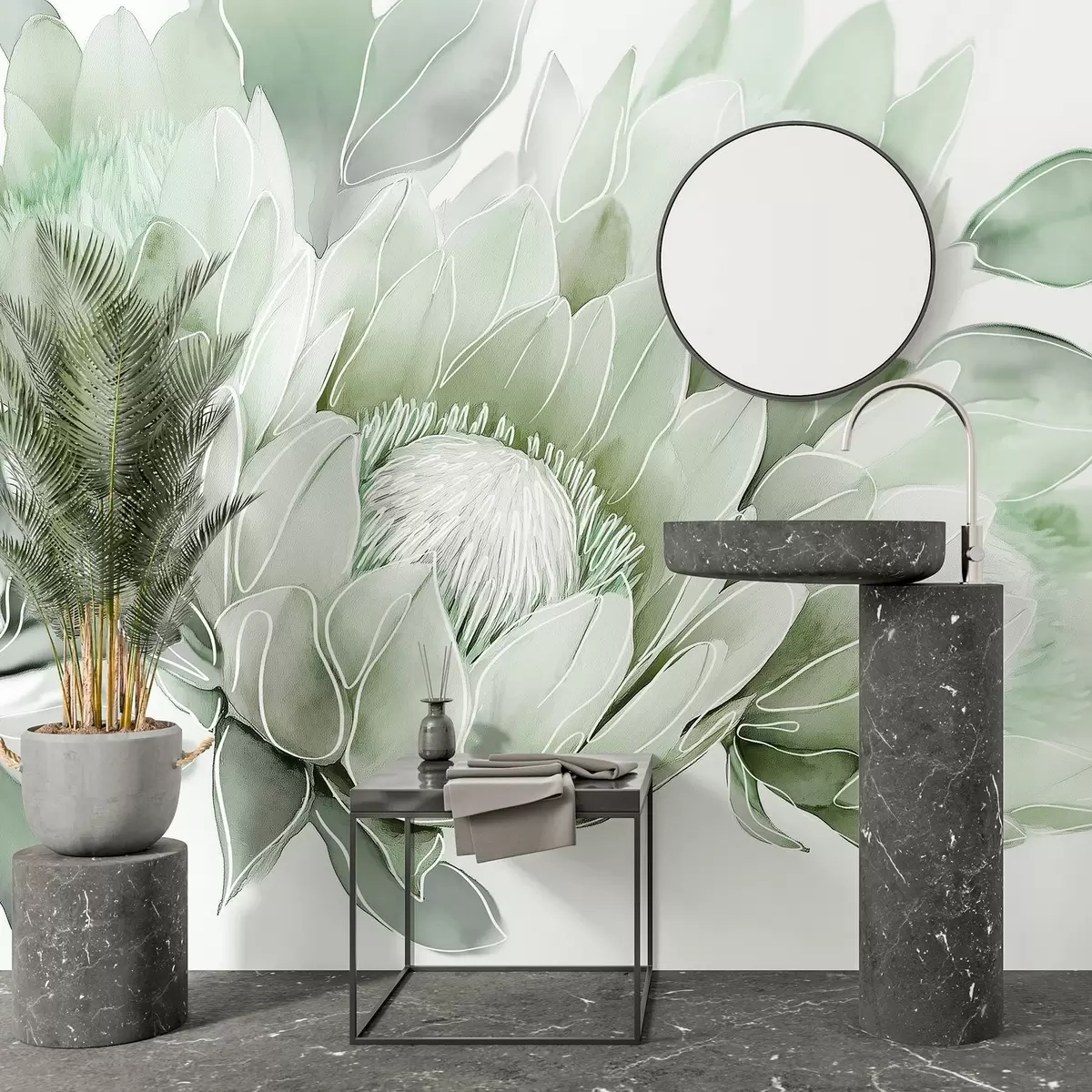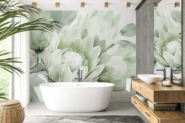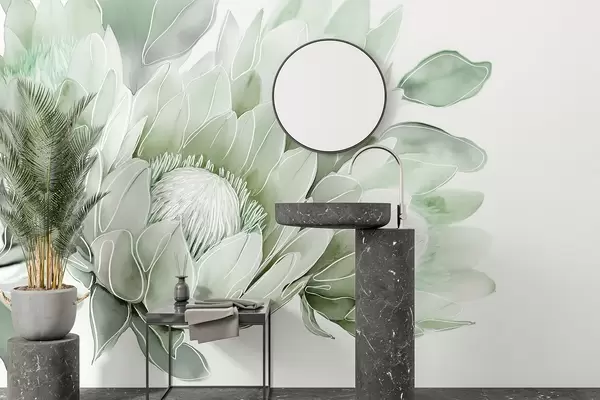 Fototapet Frumoase flori protea, linie de arta desen, tropicale, culori verzi Nr. w03669v2