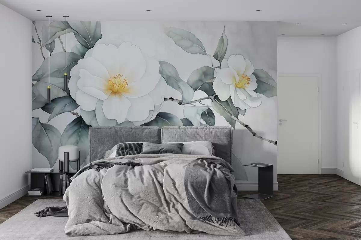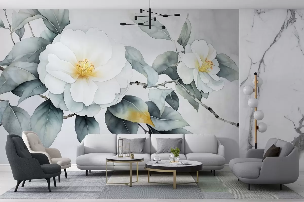 Fototapet Stil acuarelă flori camellia pe ramură, culori naturale Nr. w03761