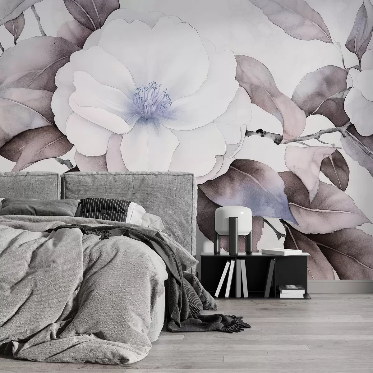 Fototapet Stil acuarelă flori camellia pe ramură, culori violet Nr. w03761v1