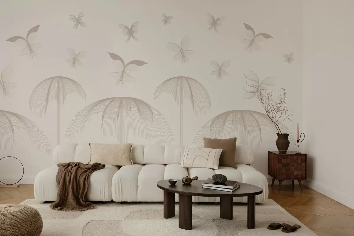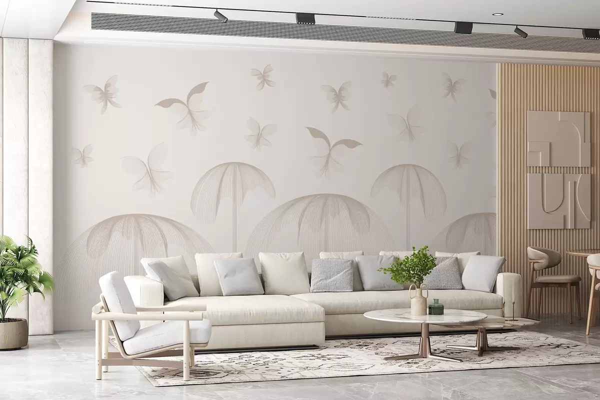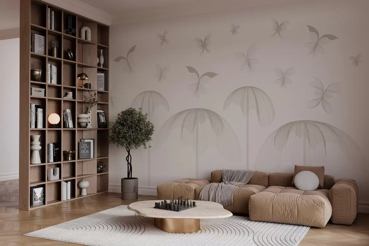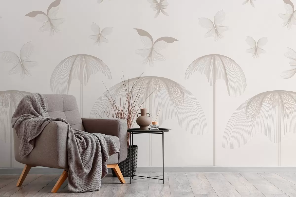 Fototapet tapet liniar minimalist fluturi și fântâni pe un fundal lăptos Nr. w03762