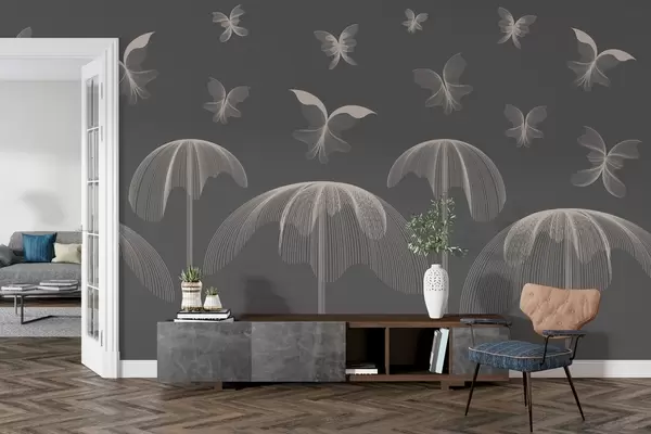 Fototapet tapet liniar minimalist fluturi și fântâni pe un fundal gri închis Nr. w03762v1