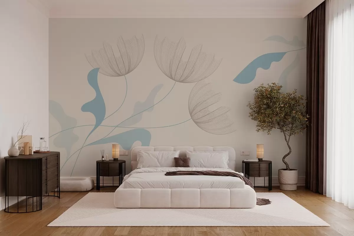 Fototapet flori elegante minimaliste în tonuri de albastru deschis pe un fundal bej Nr. w03763v1