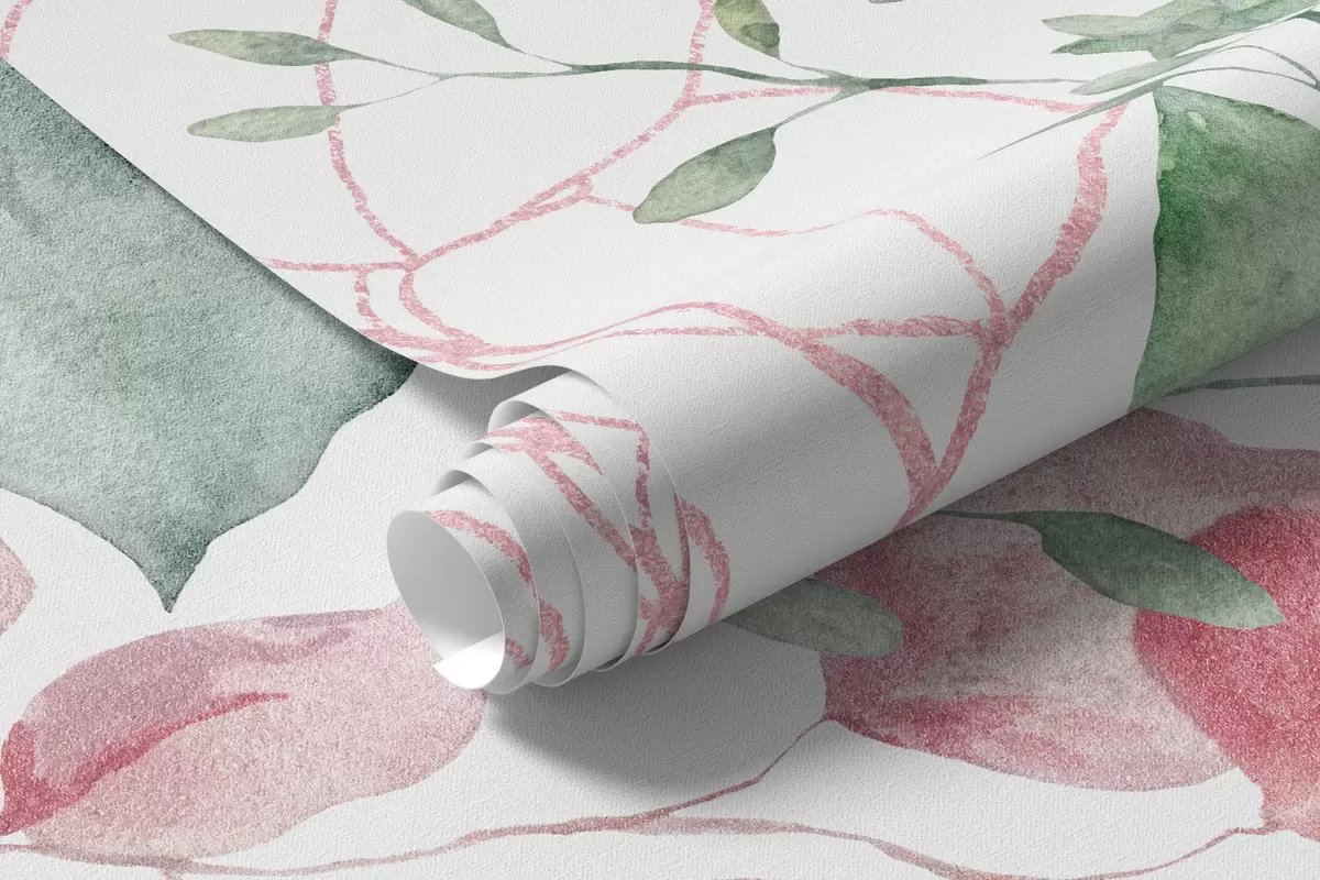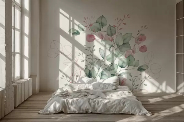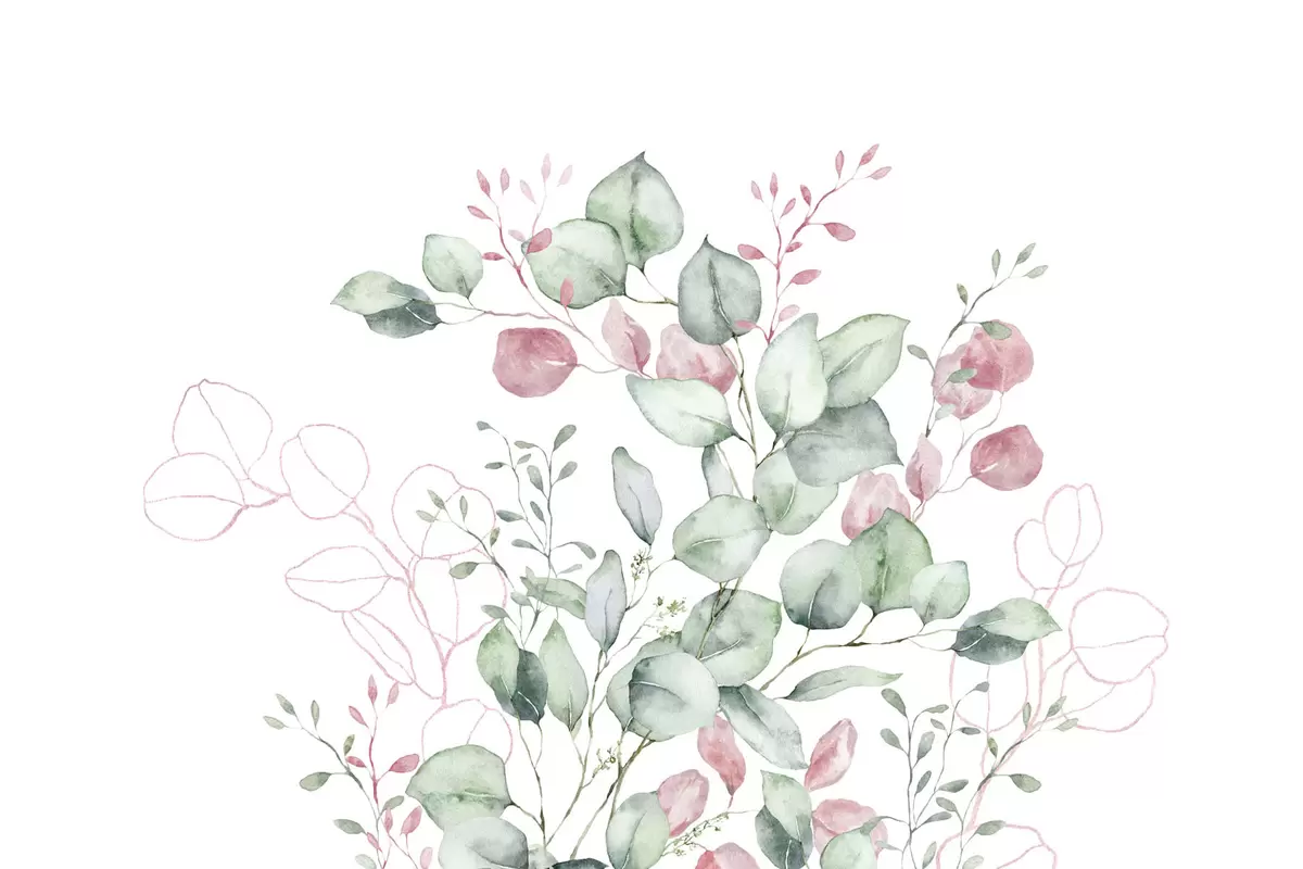 Fototapet Vegetație și ramuri imitație de acuarelă texturată, nuanțe de verde și roz Nr. w03927v2