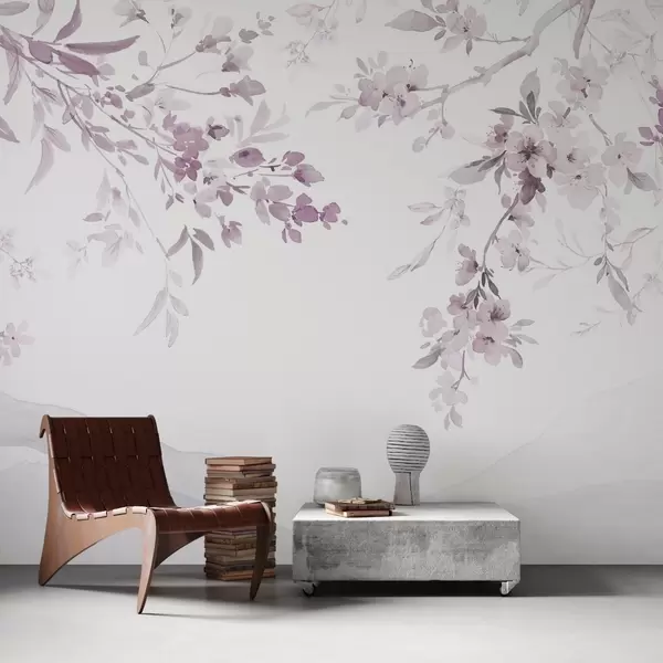 Fototapet Ramuri înflorite, imitație de acuarelă, nuanțe violet-roz Nr. w03935v1