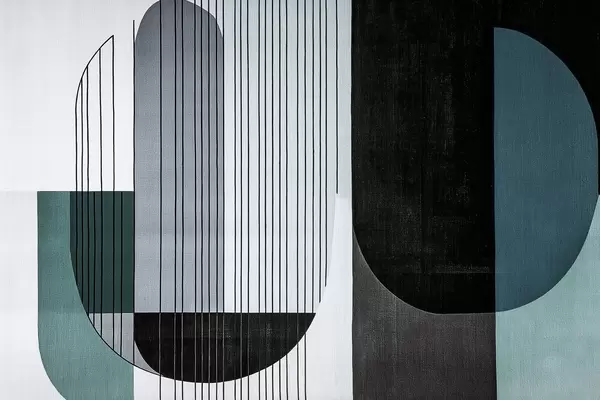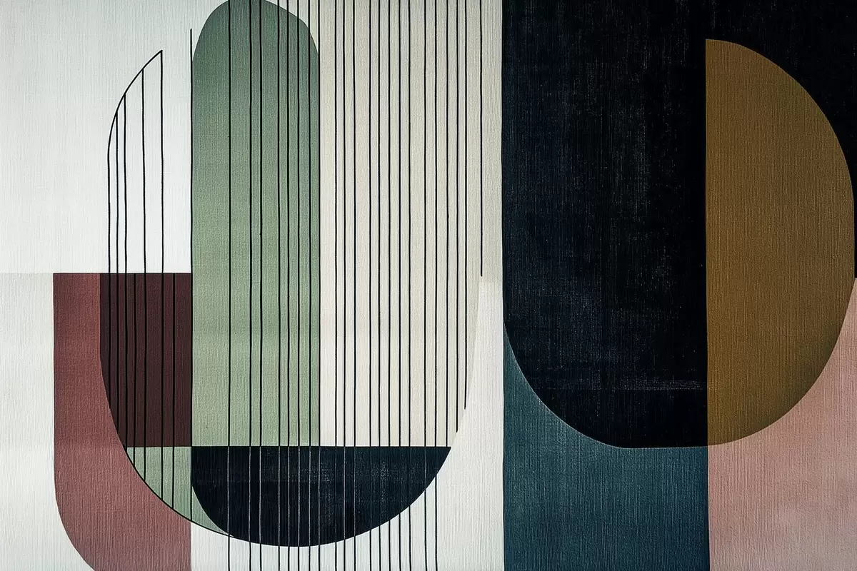 Fototapet compoziție geometrică abstractă modernă cu forme suprapuse și modele de linii verticale, linii subțiri care umplu trapezoide și ovale, suprapunere de textură textilă moale, tonuri calde, cum ar fi verde măslin, taupe, bej și cărbune, efecte subtile de transparență între forme Nr. w03937