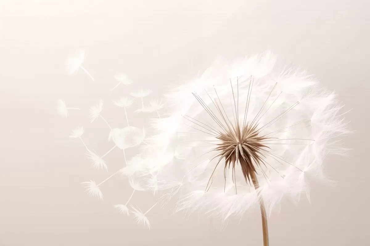 Fototapet Compoziție florală modernă, moale, cu un cap de păpădie complet înflorit și semințe plutitoare, așezate pe o textură delicată de tip textil Nr. w03939