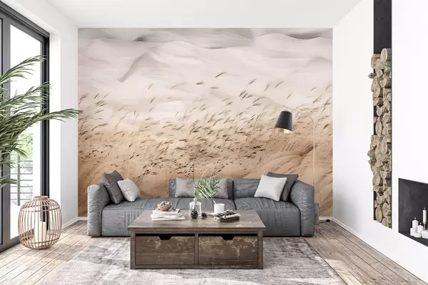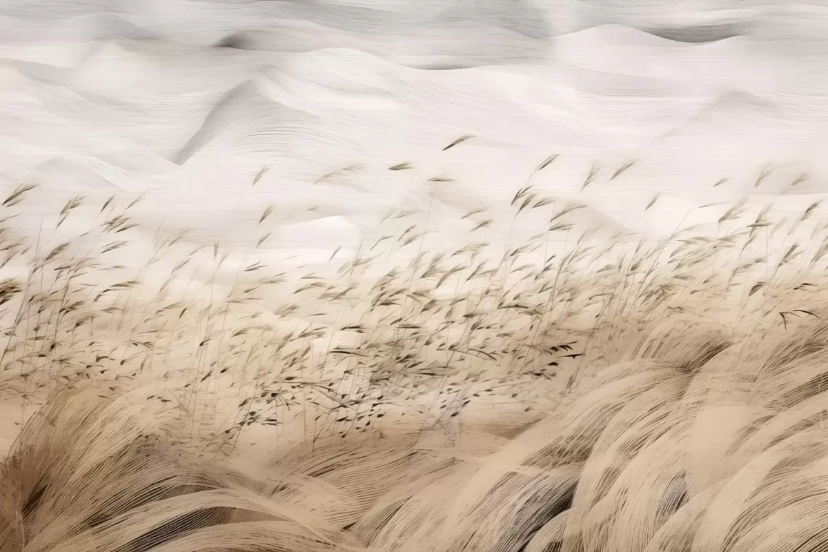 Fototapet câmpuri abstracte de iarbă suflate de vânt în tonuri de bej și piatră, linii de schiță cu cerneală cu fundal de hârtie texturată, calm rural nordic Nr. w03941