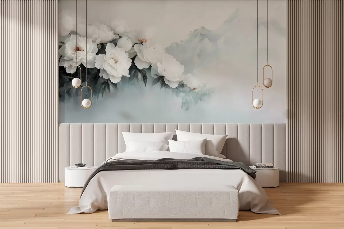 Fototapet pitorești bujori albi luxurianți pe fundalul munților cețoși Nr. w03965