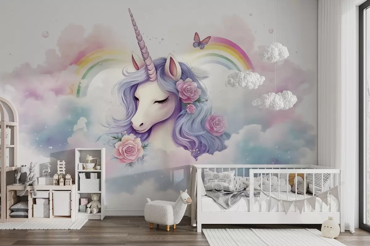 Fototapet Unicorn pastelat în nori cu curcubeu și trandafiri Nr. w03990