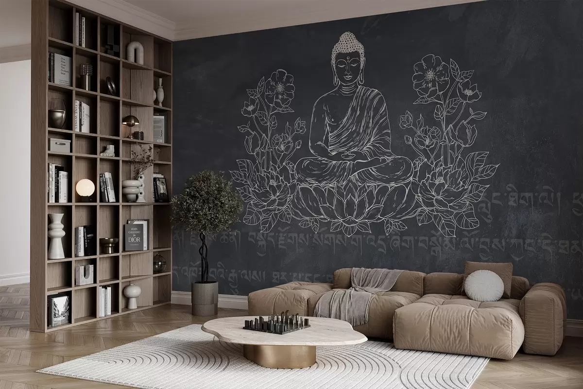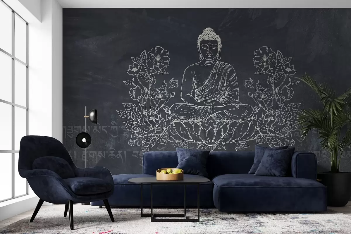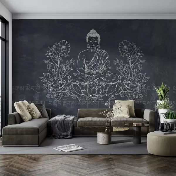 Fototapet Buddha meditând cu flori de lotus, line art, oriental, fundal întunecat Nr. w04008