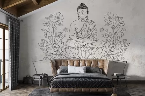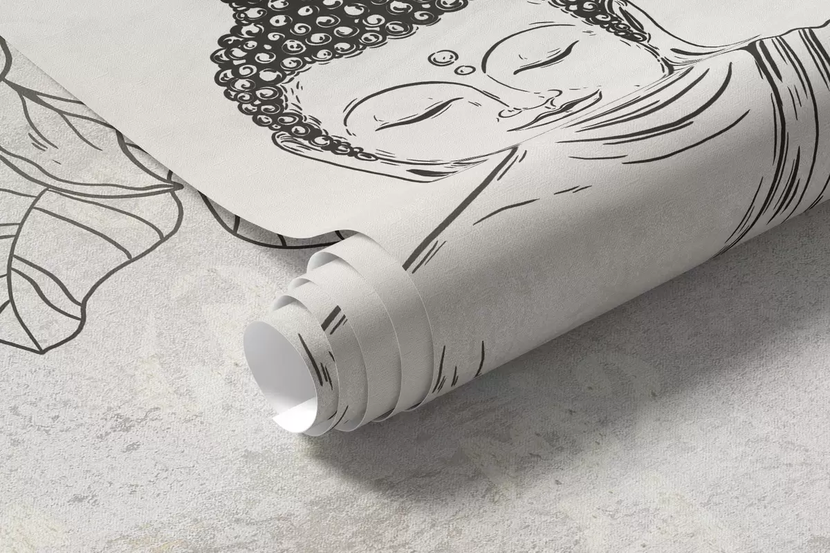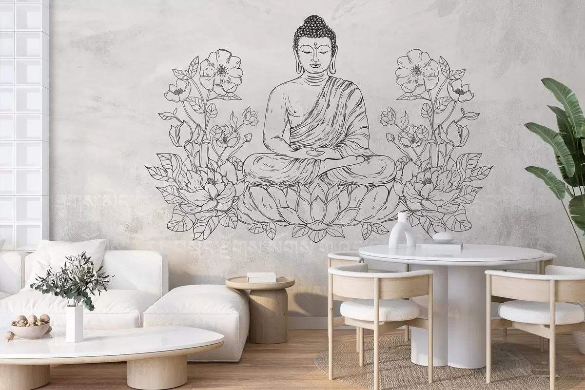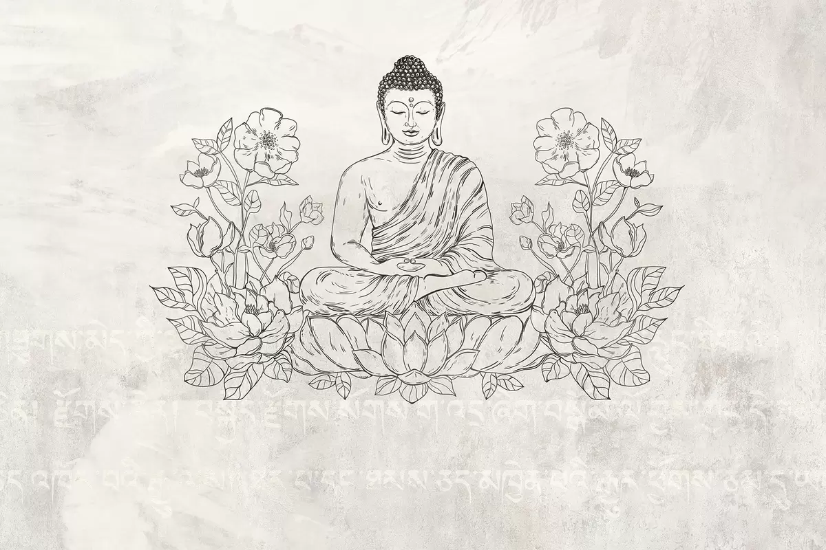 Fototapet Buddha meditând cu flori de lotus, line art, oriental, fundal bej Nr. w04008v1