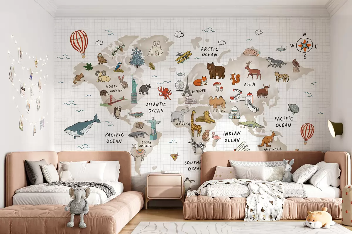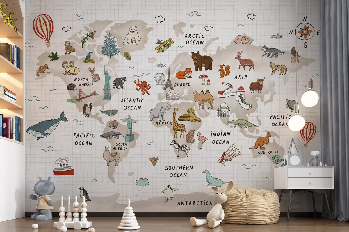 Fototapet Harta lumii cu animale și repere Nr. w04011