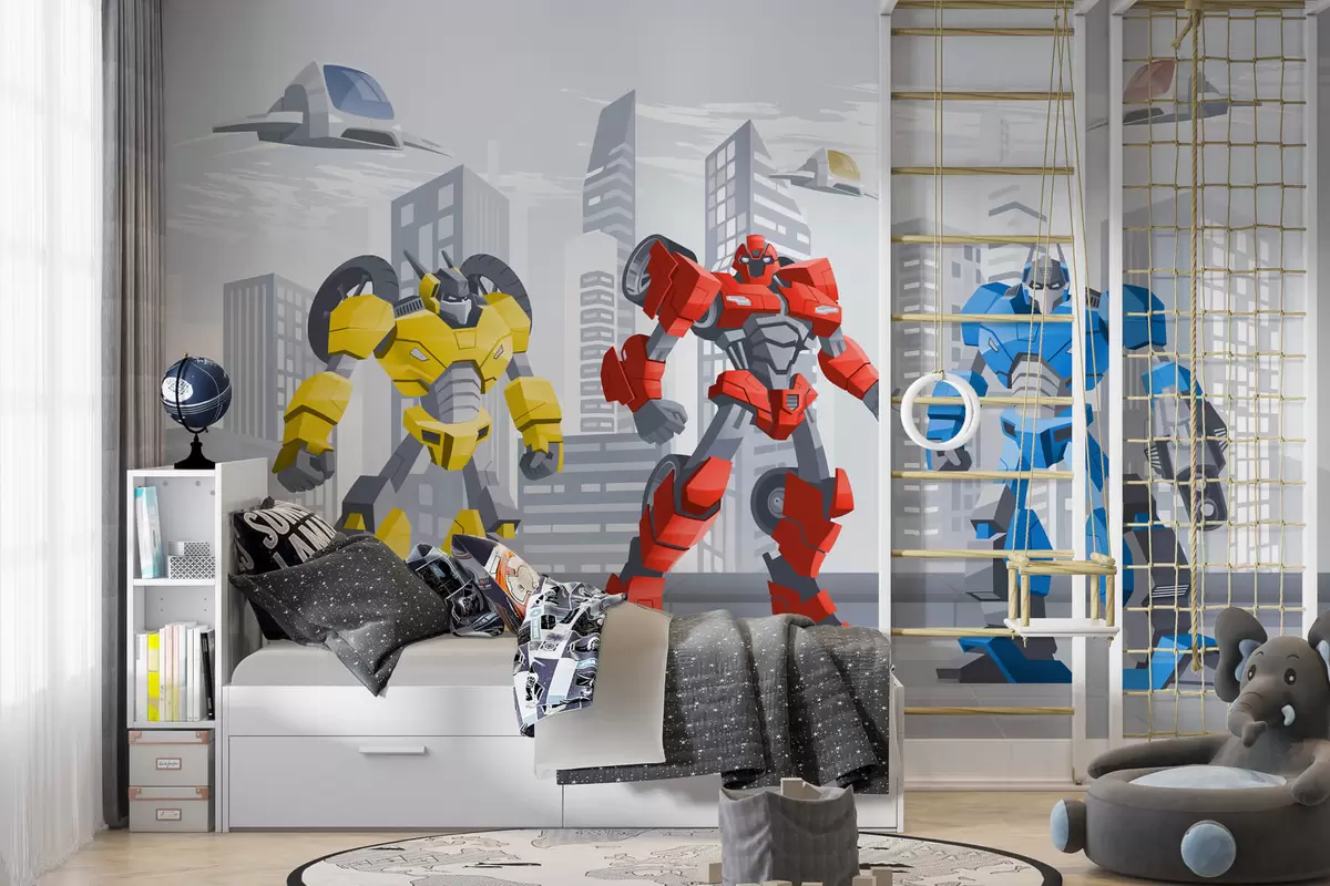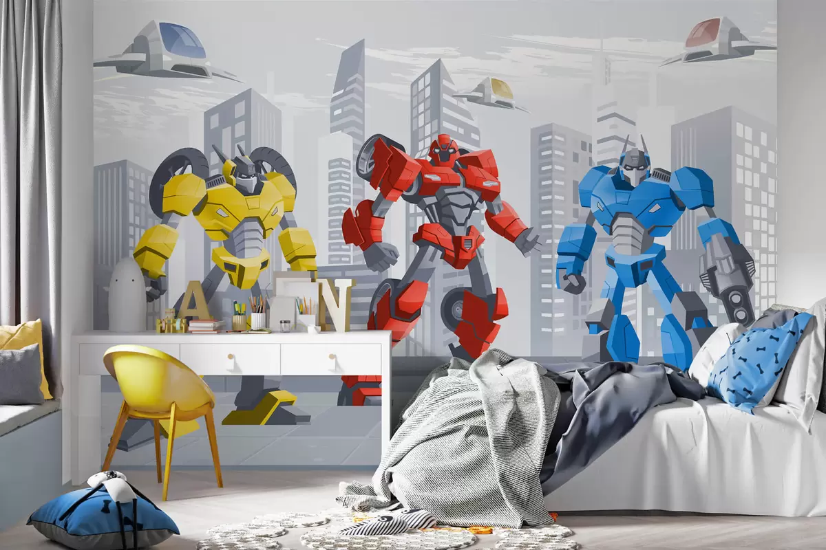 Fototapet Roboți transformatori pe fundalul unui oraș monocrom Nr. w04012