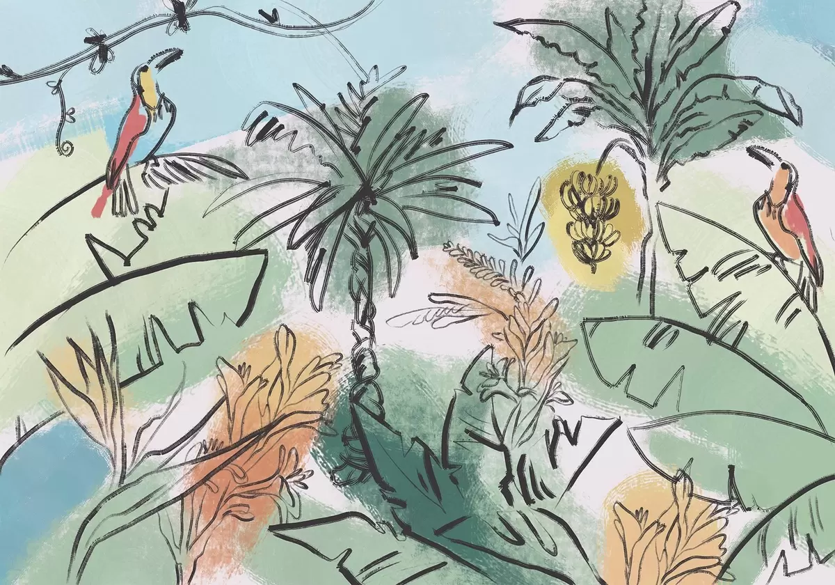 Fototapet Imprimeu tropical cu papagali, culori bogate, tropice Nr. w04019