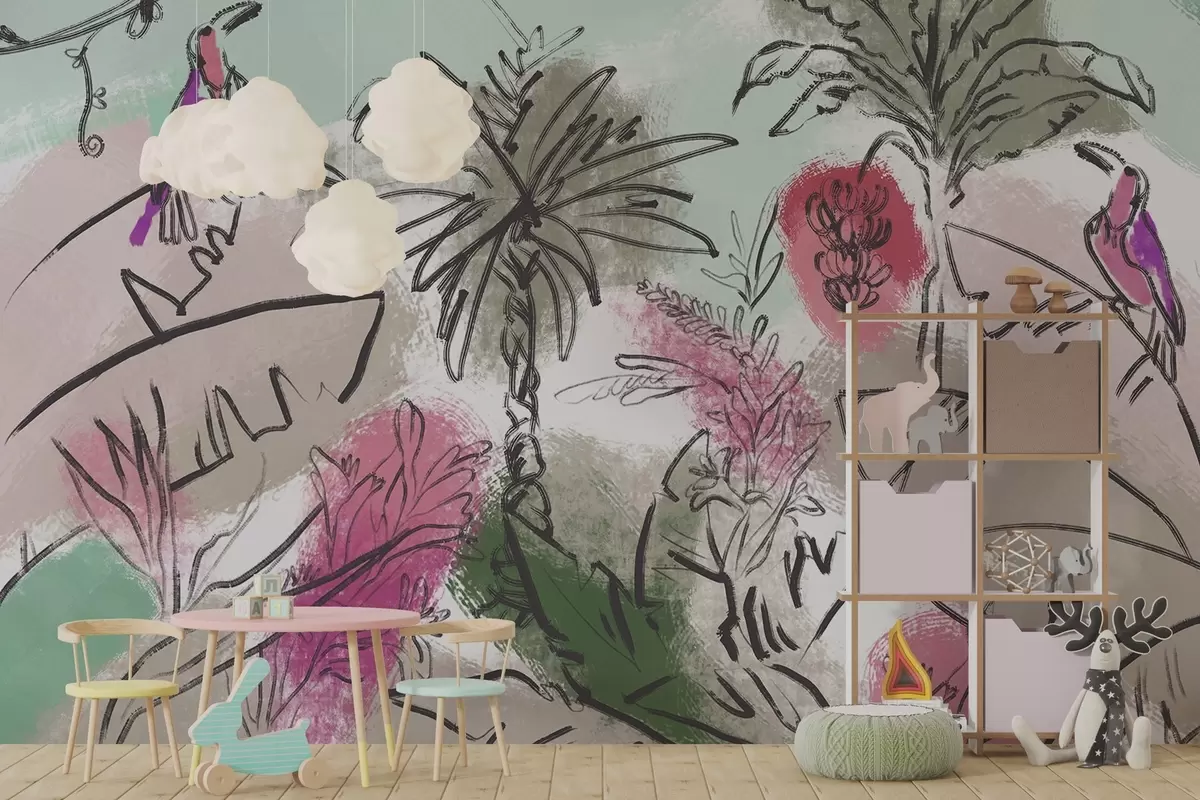 Fototapet Imprimeu tropical cu flori roz, papagali exotici Nr. w04019v1