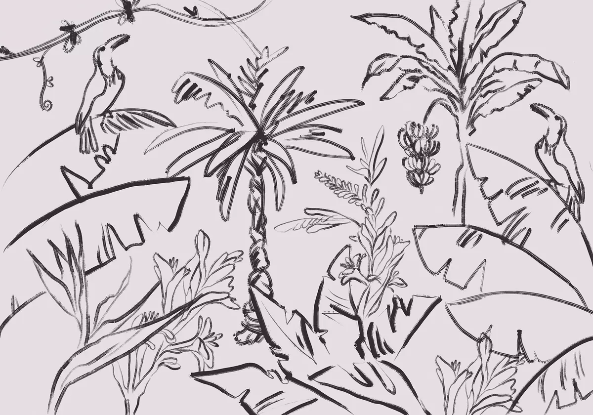 Fototapet Model tropical în culoare neagră, palmieri, banane, grafică de contur Nr. w04020v7
