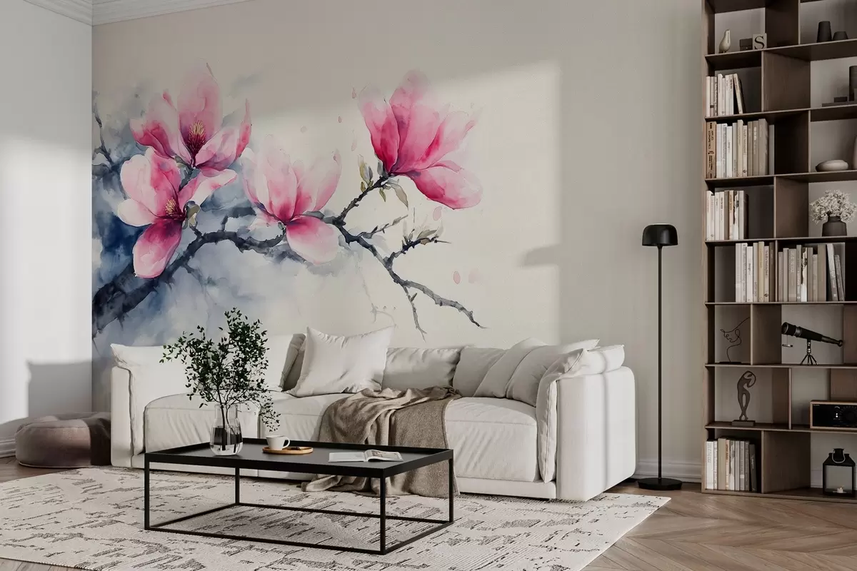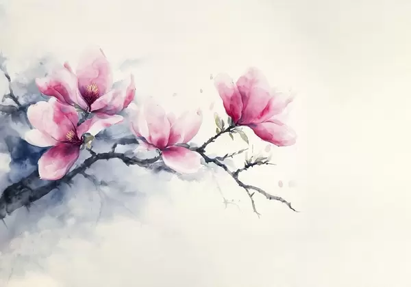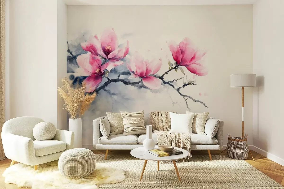 Fototapet ramură înflorită de magnolie roz pe un fundal fildeș Nr. w04027