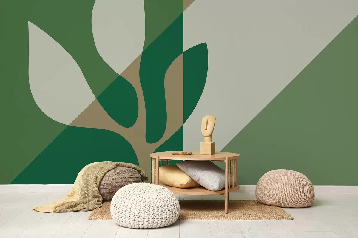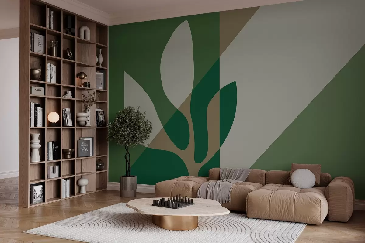 Fototapet plantă abstractă grafică pe fundal de geometrie în culori verde și ocru Nr. w04028